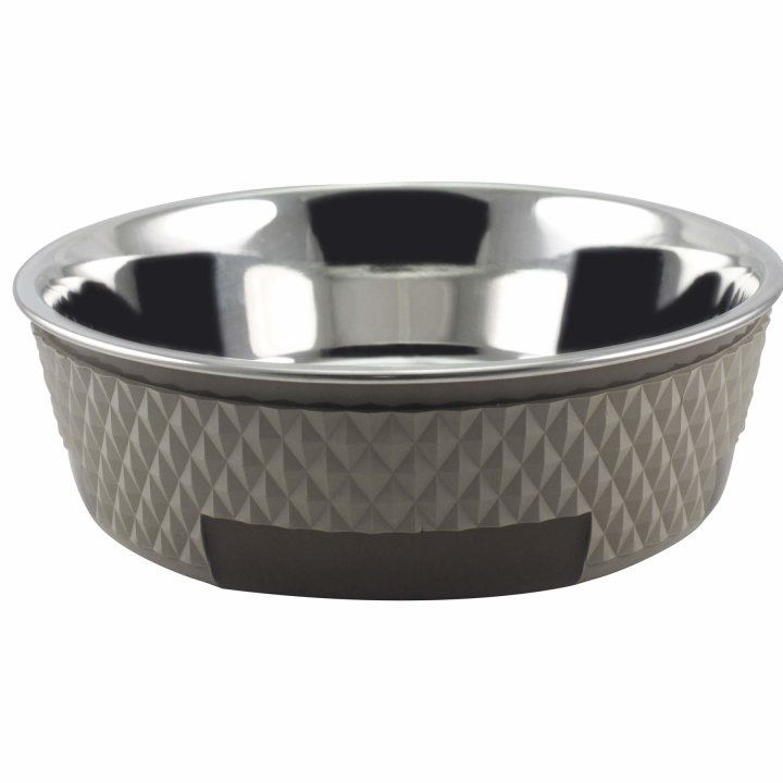 Hochwertiger Edelstahlnapf mit doppelwandiger Gummiumrandung, Außendurchmesser ca.: 14 cm, Innendurchmesser oben ca.: 12 cm, Höhe ca.: 4,5 cm, Inhalt: 350 ml